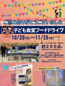 子ども食堂フ~ドドライブ(令和7年10月20日~11月20日)へご協力いただき、誠にありがとうございました。お米、パックご飯、菓子、飲料など約200点の食品をお寄せいただきました。11月27日、中村区子ども食堂・地域食堂交流会にて、食堂のみなさんへ寄贈いたしました。今後とも、子ども食堂をはじめとする地域福祉活動への応援をよろしくお願いいたします。